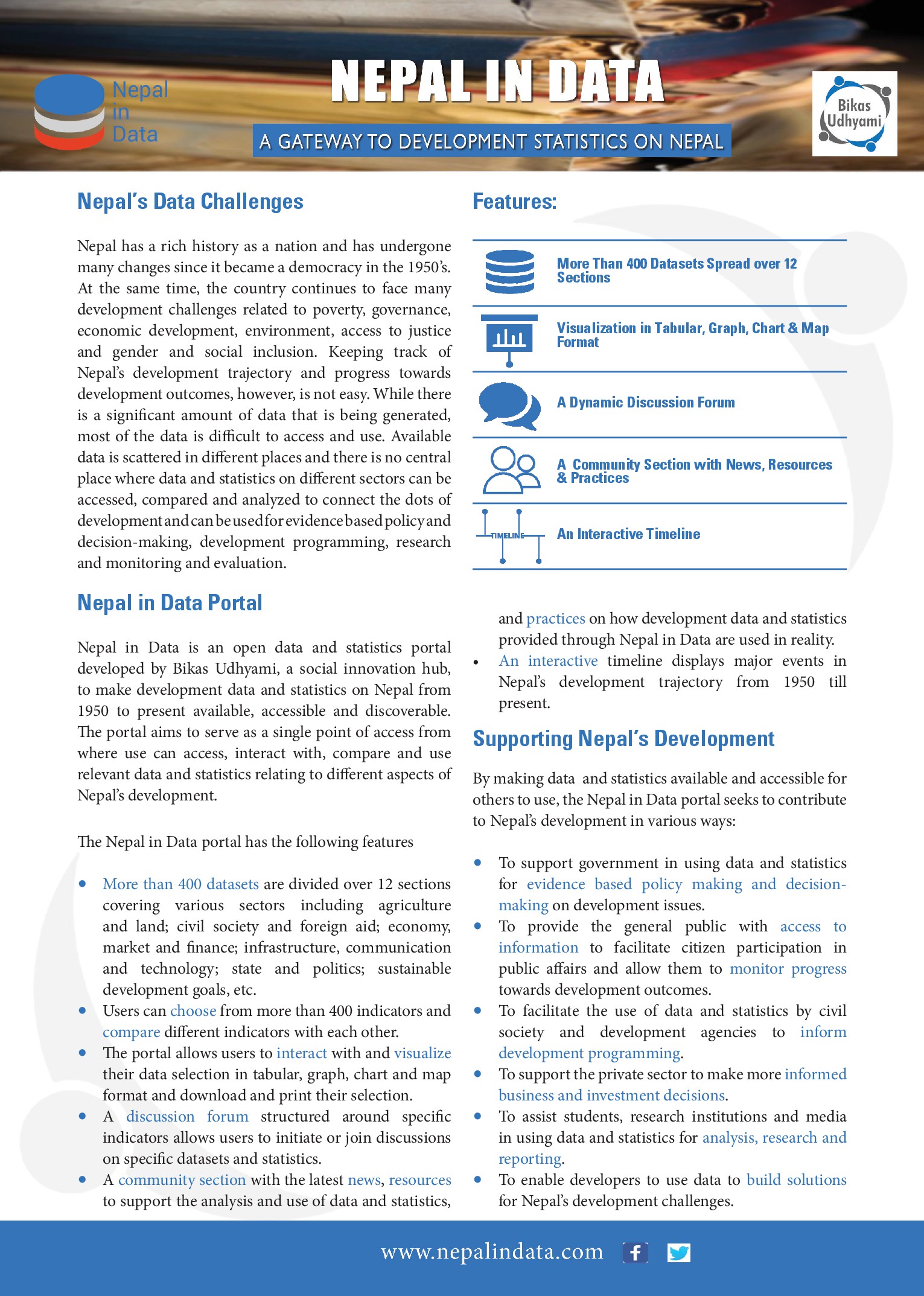 Nepal in Data (NiD) is an open data and statistics portal developed by Bikas Udhyami to make development data and statistics on Nepal from 1950 to present available and accessible to wide audience. The portal aims to serve as a single point of entry from where users can access, interact with, compare and use data and statistics relating to different aspects of Nepal’s development. By making relevant data and statistics available and accessible for others to use, the Nepal in Data portal seeks to contribute to Nepal’s development in various ways: